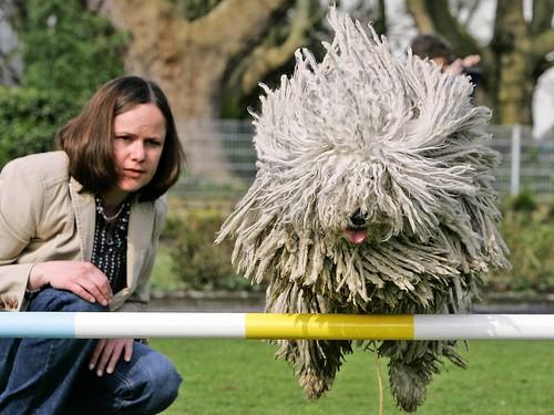 Hungarian Puli sheep dog, Fee, jumps as her owner Eva Meyer watches during a preview for a pedigree dog show in Dortmund on April 24.