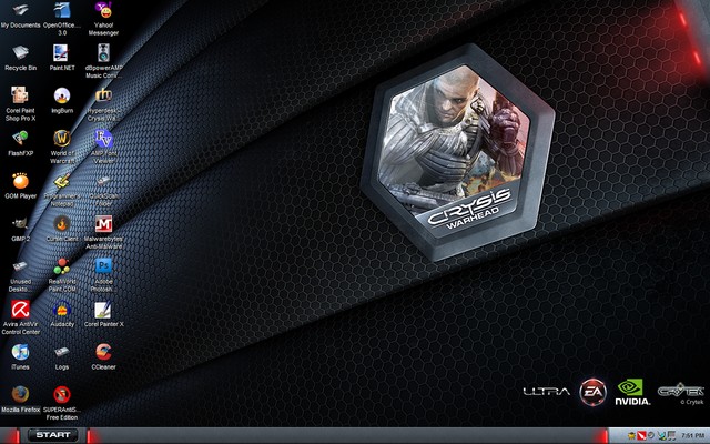 Armored drive icons, illuminated Windows start menus, custom windows, buttons and dialog boxes, a nanosuit-inspired custom wallpaper, the Official Crysis Warhead Windows XP desktop theme from Electronic Arts, NVIDIA, Ultra PC & The Skins Factory, has it all.