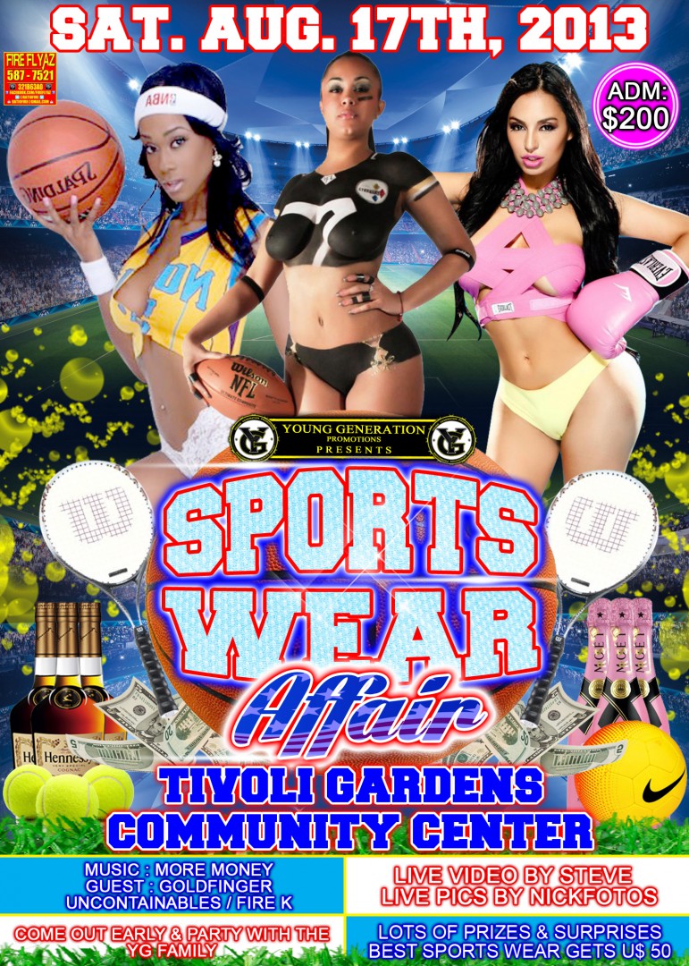 sports wear affair the maddest party for the summer august 17 at the tivoli gardens community center 50 USD for the best dressed females lots of prizes an suprises cum out for endless enjoyment party starts at 6 till u say when tr888888 niceness